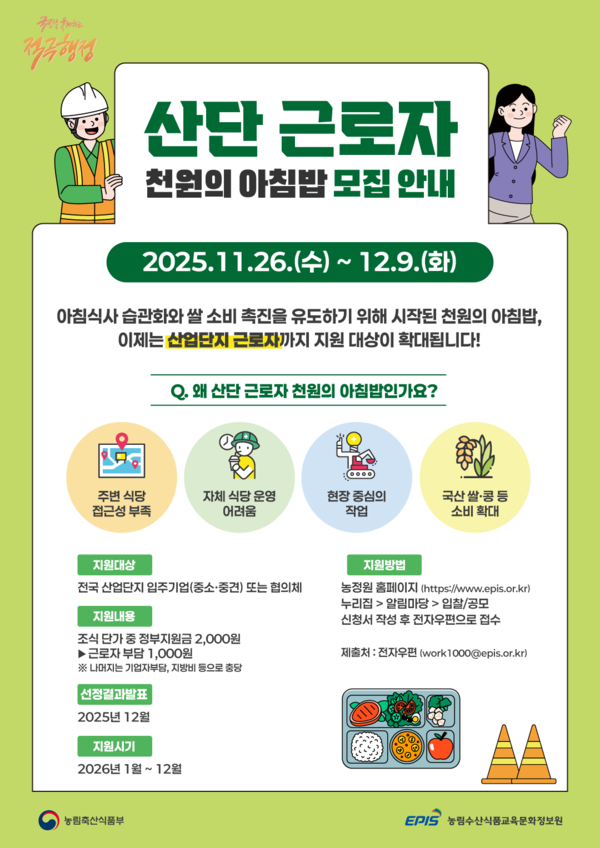 농림축산식품부는 전국 대학교와 산업단지 입주기업 또는 협의체 등 조직을 대상으로 2026년도 천원의 아침밥 사업 참여 신청을 11월 26일부터 12월 9일까지 받는다.