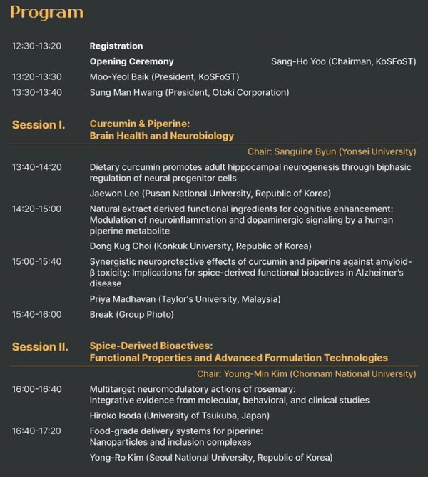 첫 번째 세션은 변상희 교수(연세대)가 좌장을 맡아, 카레의 주요 성분인 커큐민과 피페린이 뇌 건강에 미치는 영향에 대한 최신 연구를 논의한다.