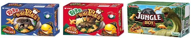 중국 ‘공룡밥’(현지명 하오뚜어위 파시앤 콩롱다오 好多魚, 发现恐龙岛)은 공룡의 강한 이미지에 맞춰 바삭한 식감을 강화하고, 아이들이 좋아하는 스테이크맛과 해산물파스타맛 2종으로 출시됐다. 공룡알 모양의 요거트볼도 들어있다.