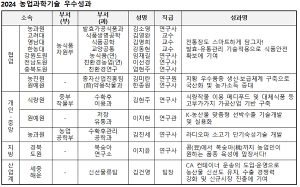 개인(중앙) 부문에서는 △식량작물 이용 메디푸드 및 대체식품 등 고부가가치 가공산업 기반 구축(국립식량과학원 김현주 연구사) △K-농산물 맞춤형 선박 수출 기술 개발 및 실용화(국립원예특작과학원 이지현 연구관) △라디오파 소고기 단기숙성기술 개발(국립농업과학원 김진세 연구사)이 상을 받았다. 개인(지방) 부문은 △콩(豆)에서 복숭아(桃)까지 농업인이 원하는 품종 육성에 앞장서다!(경북도농업기술원 이지윤 연구사)가 선정됐다.