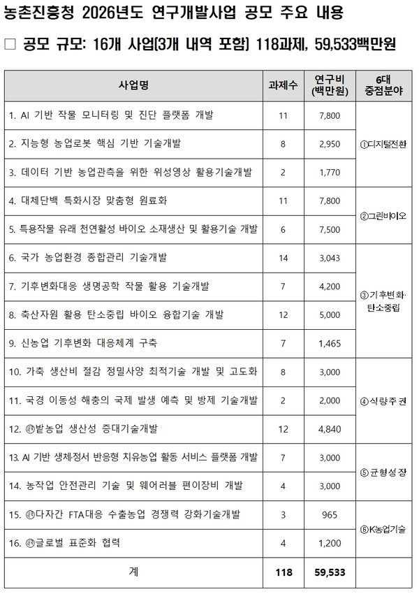 농촌진흥청(청장 이승돈)은 ‘2026년도 농업과학기술 연구개발사업’ 신규 과제를 내년 2월 2일까지 공모한다.