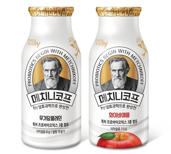 hy가 발효유 ‘메치니코프’ 신제품 2종(무가당 플레인, 화이바 애플)을 출시했다.