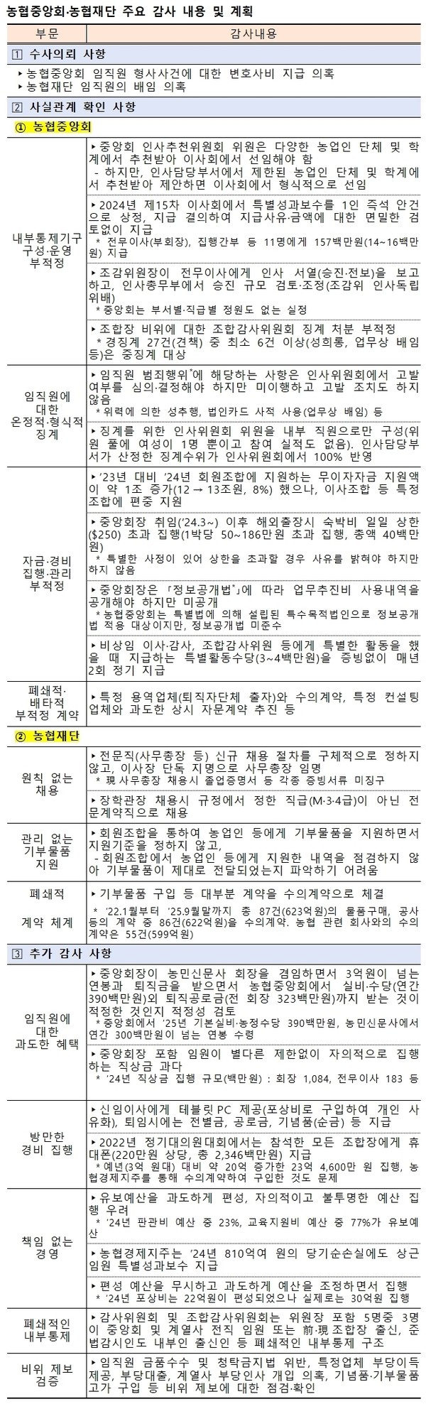 농림축산식품부(장관 송미령, 이하 농식품부)는 지난해 10월 국정감사 등을 계기로 농협 관련 비위 의혹이 반복 제기됨에 따라 ’25.11.24.~12.19.까지 총 26명(변호사 등 외부전문가 6명 포함)등 총 26명을 투입해, 농협중앙회와 농협재단에 대한 특별감사를 실시하고 8일 중간 결과를 발표했다.