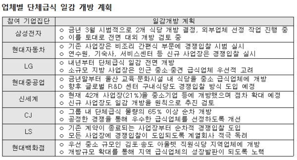 LG는 전면 개방 원칙 하에 그룹 내 단체급식 일감을 순차적으로 개방하고, CJ는 65% 이상(370만 식)을 개방하는 등 적극적인 참여 의지를 보였다.